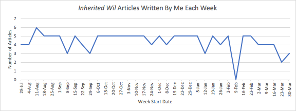 The post you’re reading right now is my 156th for Inherited Wil,2 meaning that I’ve averaged ~4.3 posts per week since I started last July. It’s funny how this graph tells a bit of a story about my year: