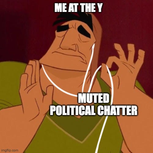 So, yesterday morning, when Nadia woke up at 6 AM to get ready to work, I let the power of Matt’s brutal challenge coarse through my veins, lifting me out of my bed and to my local YMCA. I spent about 45 minutes there. Honestly, it was a solid workout - leg day, baby.