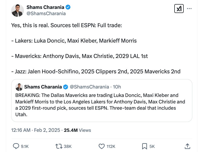 Think of the same vibe as Shams Charania having to confirm he wasn’t hacked while reporting the Luka trade: